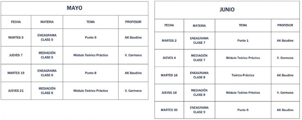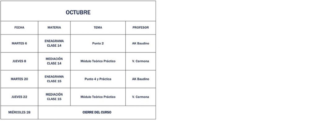 El curso está homologado para la inscripción en el Registro de Mediadores del Ministerio de Justicia. Más información sobre el curso en el siguiente enlace: Curso de Mediador Civil y Mercantil Curso de Especialización en Mediación Civil y Mercantil Online (25 horas) El curso está homologado para acreditar la formación continua del Real Decreto 980/2013, de 13 de diciembre, por el que se desarrollan determinados aspectos de la Ley 5/2012, de 6 de julio, de mediación en asuntos civiles y mercantiles. Más información sobre el curso en el siguiente enlace: Curso de Especialización en Mediación Civil y Mercantil Online Curso de Técnicas de Comunicación Positiva para Mediación (25 horas) El curso está homologado para acreditar la formación continua del Real Decreto 980/2013, de 13 de diciembre, por el que se desarrollan determinados aspectos de la Ley 5/2012, de 6 de julio, de mediación en asuntos civiles y mercantiles. Más información sobre el curso en el siguiente enlace: Curso de Técnicas de Comunicación Positiva para Mediación Curso de Mediación Transformativa (25 horas) El curso está homologado para acreditar la formación continua del Real Decreto 980/2013, de 13 de diciembre, por el que se desarrollan determinados aspectos de la Ley 5/2012, de 6 de julio, de mediación en asuntos civiles y mercantiles. Más información sobre el curso en el siguiente enlace: Curso de Mediación Transformativa Curso de Mediación en Accidentes de Tráfico (25 horas) El curso está homologado para acreditar la formación continua del Real Decreto 980/2013, de 13 de diciembre, por el que se desarrollan determinados aspectos de la Ley 5/2012, de 6 de julio, de mediación en asuntos civiles y mercantiles. Más información sobre el curso en el siguiente enlace: Curso de Mediación en Accidentes de Trafico Curso de Mediación en la Empresa Familiar (25 horas) Curso de Mediación con Integración Aplicada del Eneagrama (100 horas) El curso está homologado para la inscripción en el Registro de Mediadores del Ministerio de Justicia. FECHA DE INICIO: 10 de marzo de 2026. OBJETIVOS GENERALES La capacitación de mediadores para intervenir profesionalmente en situaciones conflictivas, integrando herramientas jurídicas, comunicacionales y psicosociales, incorporando el Eneagrama como apoyo para la autorregulación emocional y la comprensión de las dinámicas relacionales. Finalizado el curso, el alumnado estará habilitado para: El curso es completamente online y flexible, innovador y actualizado, constituyéndose en un recurso de crecimiento exponencial para el ejercicio profesional. ¿PARA QUIÉN ES ESTE CURSO? DURACIÓN: 6 meses y medio. La próxima edición del curso comienza el 10 de marzo de 2026. MODALIDAD Y CARGA HORARIA: Clases online Teórico–práctica. Se propone un curso completo de formación (100 horas, siendo un 65% de naturaleza teórica y un 35% de carácter práctico). HORARIO Y DURACIÓN DE LAS CLASES Las clases de Mediación son los jueves las 18:00 horas. Las clases de Eneagrama son los martes a las 17:45 horas. Las clases tienen una duración aproximada de dos horas. DISPONIBILIDAD El acceso a las clases grabadas estará disponible hasta diciembre de 2027. CONTENIDOS DE LAS CLASES Los temas de las clases son orientativos pudiendo variar en sus contenidos según la consideración del profesor en cada caso. Las fechas y horarios son, en principio, los establecidos en el cuadro final, pudiendo presentarse algún cambio sujeto a contingencia. ACREDITACIONES El curso está homologado para acreditar la formación continua del artículo 6 del Real Decreto 980/2013, de 13 de diciembre, por el que se desarrollan determinados aspectos de la Ley 5/2012, de 6 de julio, de mediación en asuntos civiles y mercantiles. El certificado del curso será emitido y enviado por correo electrónico por la Asociación Amira Mediación. El curso está inscrito en el Ministerio de Justicia con el número 33251. IMPARTEN: Abdul Karim Baudino Virginia Carmona Cárdenas CAMPUS VIRTUAL Y ASISTENCIA Los participantes serán matriculados en el Campus Virtual del Centro de Psicología Sufi mediante la asignación de usuario y contraseña. A través de esta plataforma tendrán acceso al enlace de Zoom de acceso a las clases en vivo y, con posterioridad podrán acceder a los videos grabados que quedarán disponibles en el Campus Virtual. Para acompañar adecuadamente el proceso formativo, se solicita que las personas participantes cuenten con una presencia mínima del 80% de las clases. Esta participación puede realizarse asistiendo en vivo —con o sin cámara activada— o bien mediante la visualización posterior de las clases grabadas disponibles en el campus virtual. El campus cuenta con un sistema que registra dichas visualizaciones, lo que permite acompañar y valorar el recorrido de cada participante de manera flexible y respetuosa de sus tiempos. CONTENIDOS 1) MEDIACIÓN (Virginia Carmona Cárdenas) MÓDULO 1. FUNDAMENTOS JURÍDICOS DE LA MEDIACIÓN. Concepto legal de mediación conforme al artículo 1 de la Ley 5/2012. La mediación como medio adecuado de solución de controversias en asuntos civiles y mercantiles. Naturaleza jurídica de la mediación y su encaje en el sistema judicial español. Principios informadores de la mediación: Voluntariedad y libre disposición (art. 6). Igualdad de las partes e imparcialidad del mediador (art. 7). Neutralidad del mediador (art. 8). Confidencialidad del proceso (art. 9). Finalidad social y jurídica de la mediación. Ámbitos de aplicación conforme al artículo 2 de la Ley 5/2012. Materias excluidas de la mediación. Mediación judicial y extrajudicial: diferencias operativas, efectos jurídicos y procesales. El rol del mediador según el contexto de intervención. Límites legales y éticos del proceso de mediación. MODULO 2. EL CONFLICTO EN EL CONTEXTO DE LA MEDIACIÓN. Concepto de conflicto y su relevancia jurídica. Tipología del confli